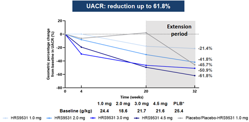 32周后,HRS9531各剂量组中最高降低丙氨酸氨基转移酶转氨酶(ALT)31.8%、天门冬氨酸转移酶(AST)23.5%(图4)。HRS9531各剂量组对尿白蛋白/肌酐比值(UACR)的降低作用呈现剂量依赖性。治疗32周后,HRS9531 4.5 mg组UACR降幅可达61.8%(图5)。
